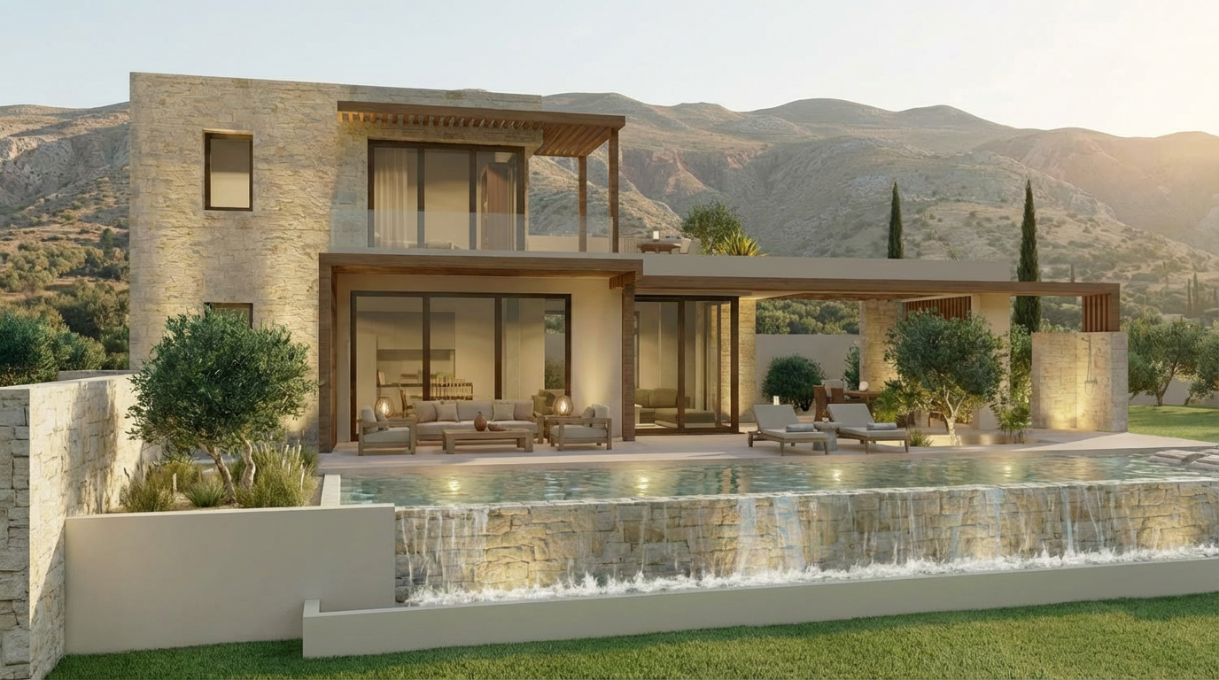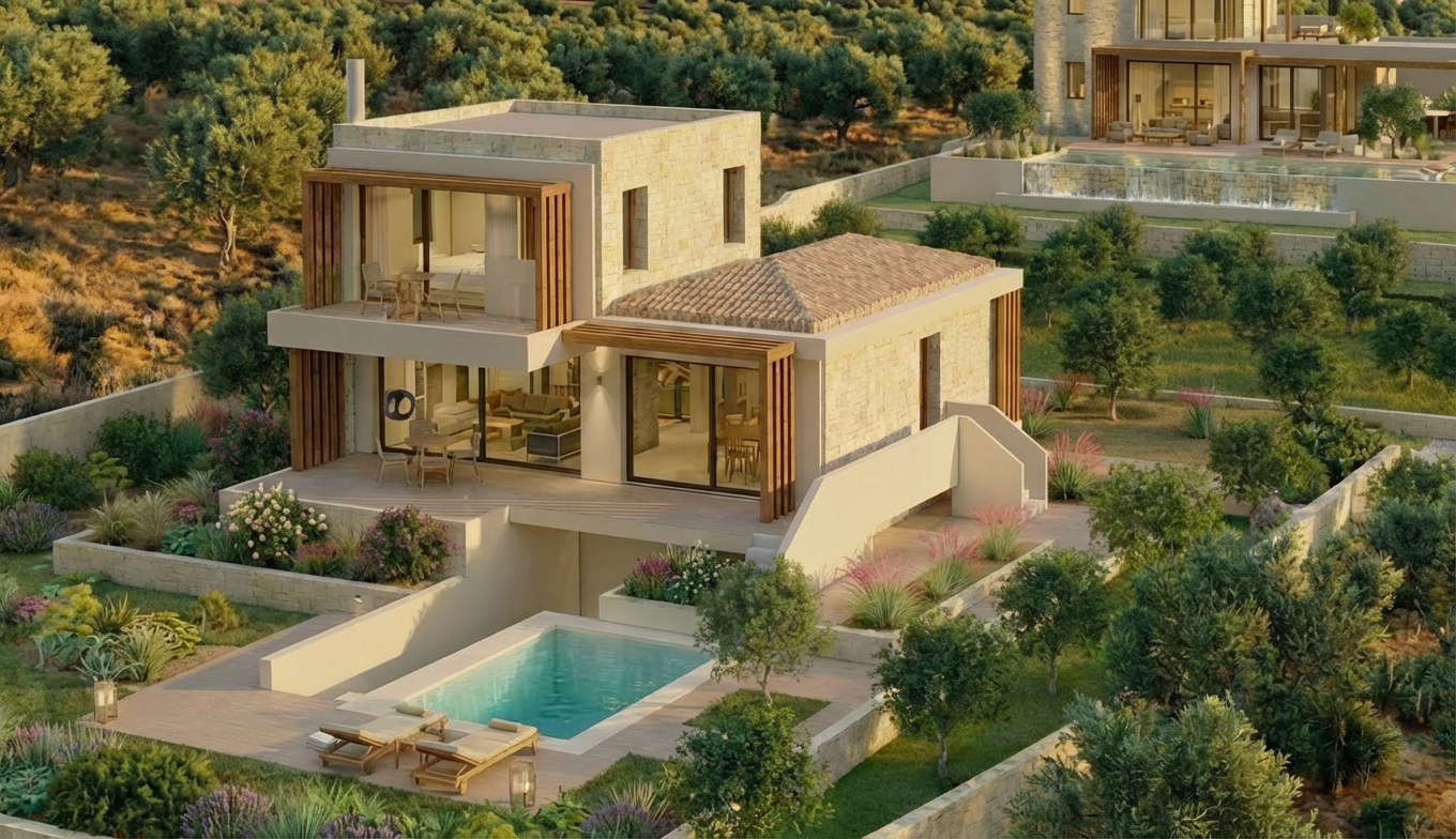 Κάθε κατοικία αναπτύσσεται με σεβασμό στο ανάγλυφο του εδάφους, εξασφαλίζοντας ανεμπόδιστη θέα στο φυσικό τοπίο και άμεση επαφή με το φως και τη φύση. Οι καθαρές γεωμετρικές γραμμές, οι μεγάλες ανοιγόμενες επιφάνειες και οι προσεκτικά σχεδιασμένοι υπαίθριοι χώροι ενισχύουν την αίσθηση ελευθερίας και χαλάρωσης, ενώ οι ιδιωτικές πισίνες και οι φυτεμένοι κήποι προσφέρουν απόλυτη ιδιωτικότητα.